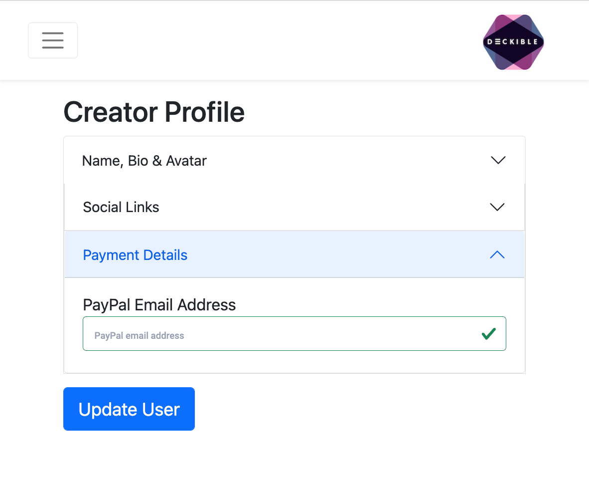 Complete your PayPal email and click update. This is the email you use for PayPal to receive payments. If you don't have a paypal account you will need to create one.