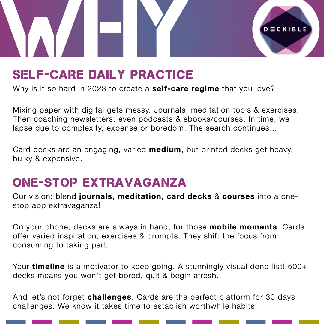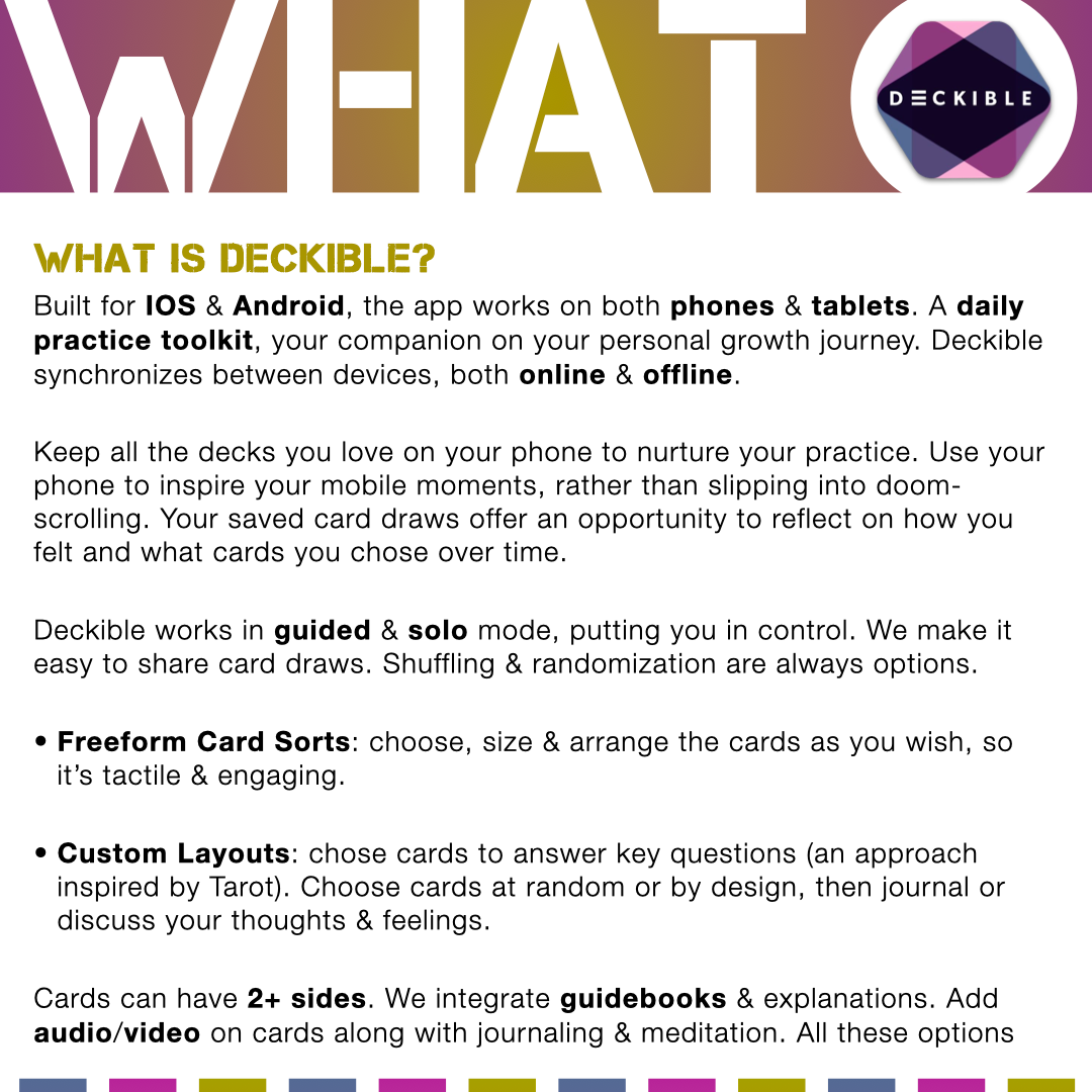 Built for IOS & Android, the app works on both phones & tablets. A daily practice toolkit, your companion on your personal growth journey. Deckible synchronizes between devices, both online & offline.