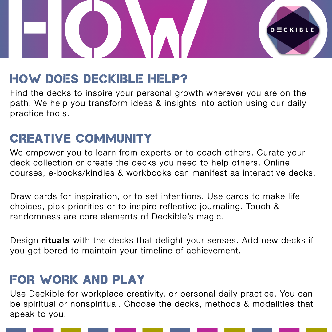 Use Deckible for workplace creativity, or personal daily practice. You can be spiritual or nonspiritual. Choose the decks, methods & modalities that speak to you.