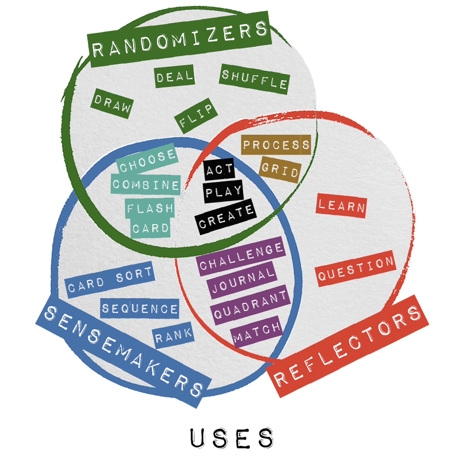 Uses: This deck defines the 21 ways we use card decks. The ways are split into three types of activity: Randomizers, Sensemakers and Reflectors.