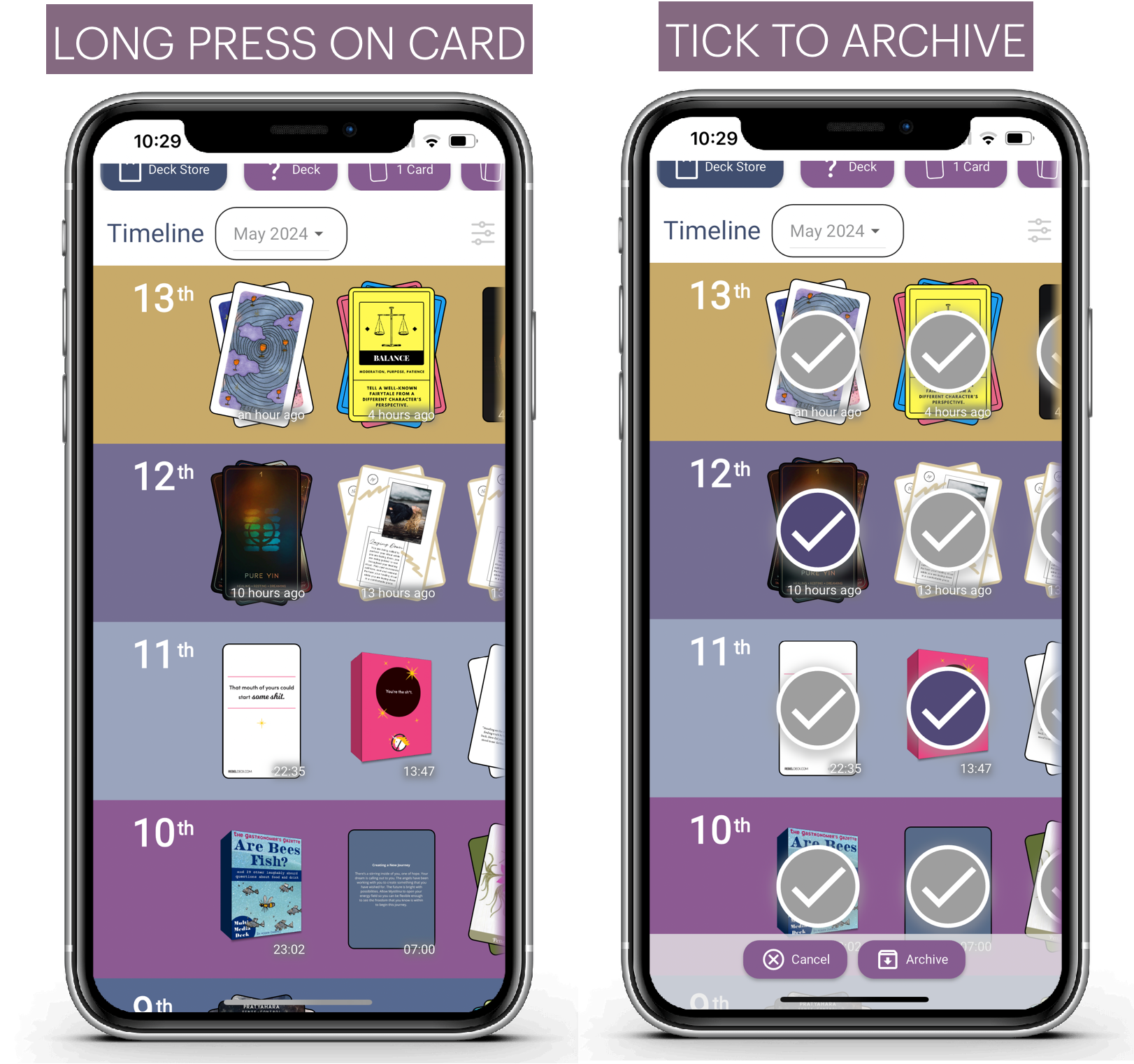 Simply "long press" on any card in the timeline to go to "Archive" mode. Then choose which draws to archive. Click Archive to complete the archiving of the selected draws.
