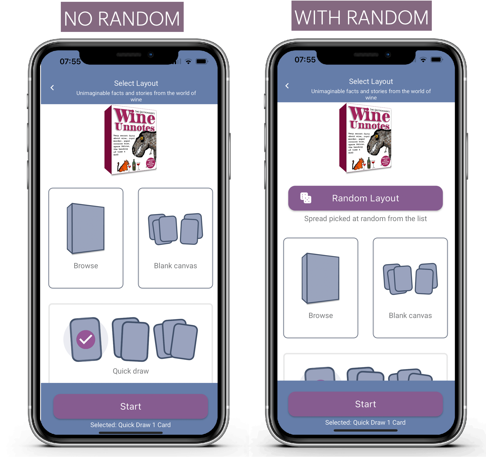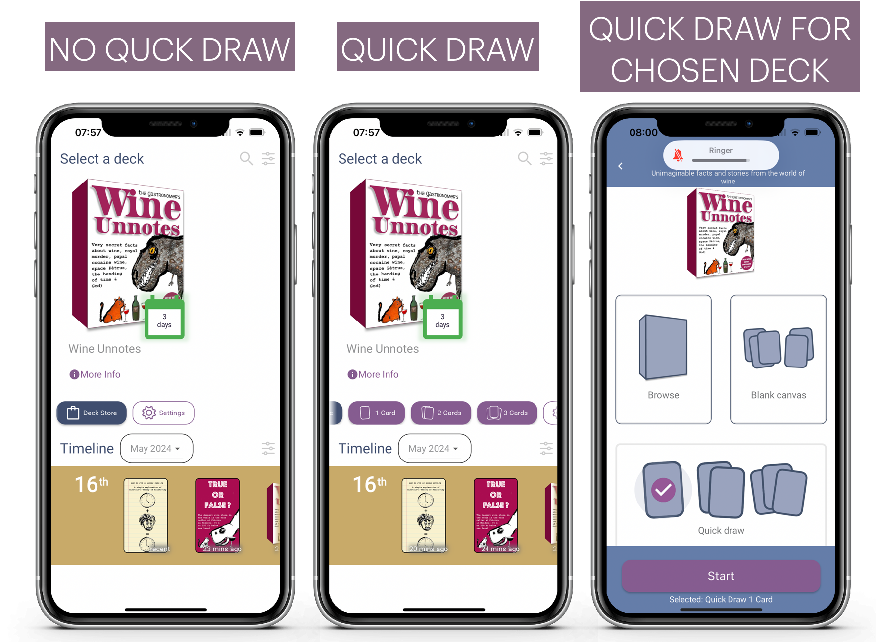 With quick draw on the home page it picks a random deck and draws 1, 2 or 3 cards.