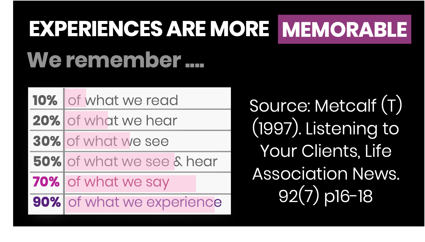 Research shows we remember 90% of what we experience vs 10% of what we read.