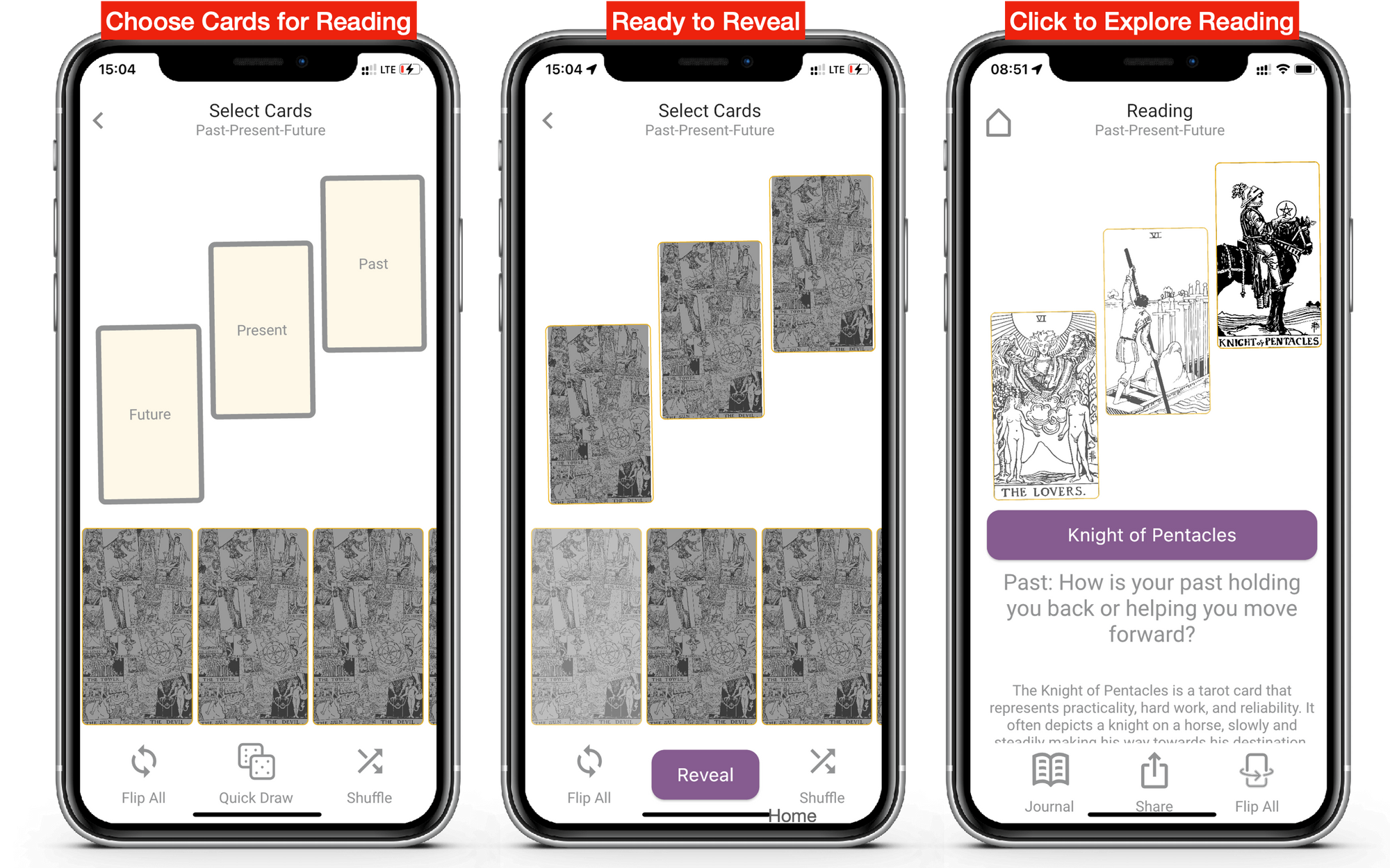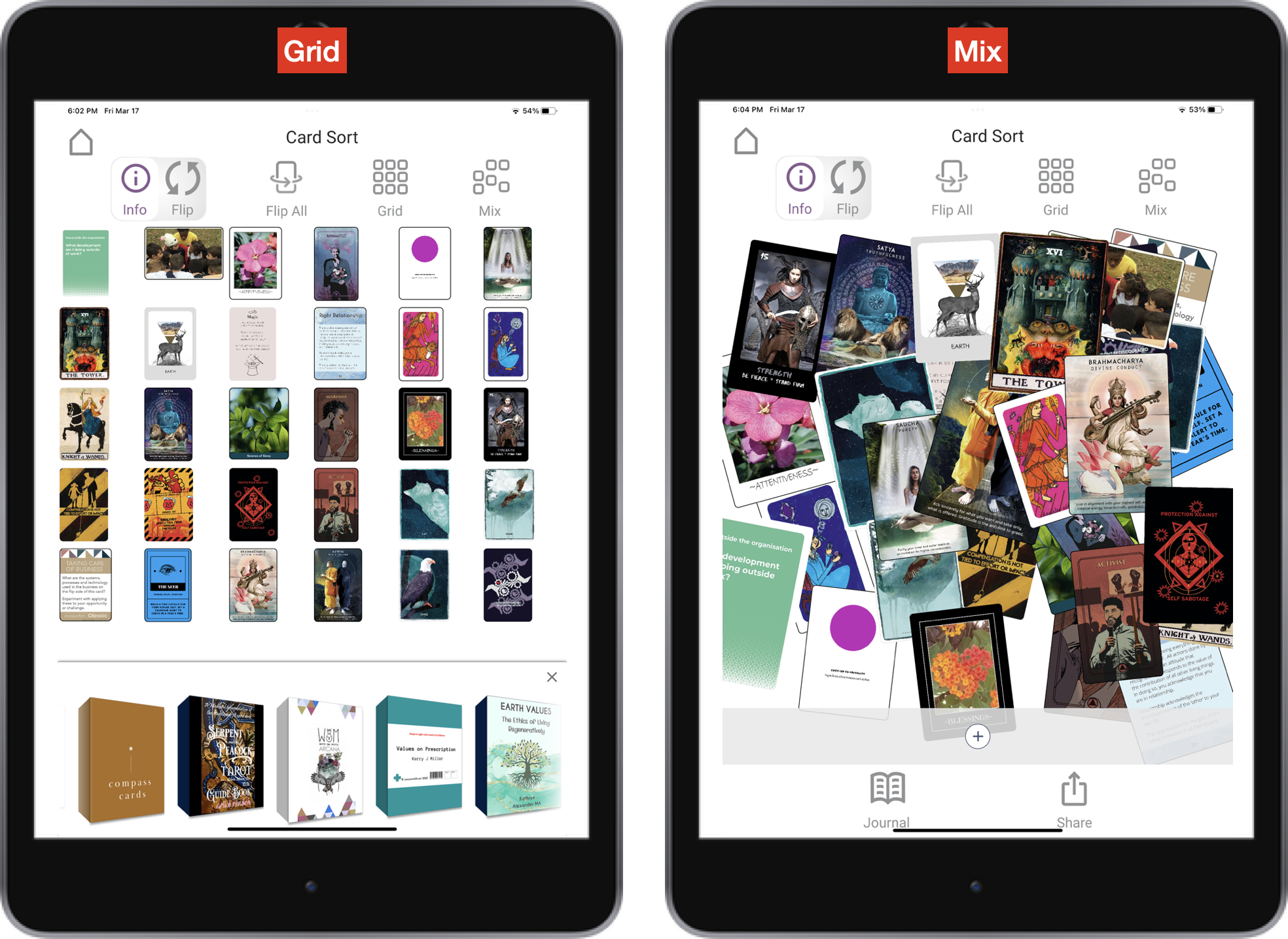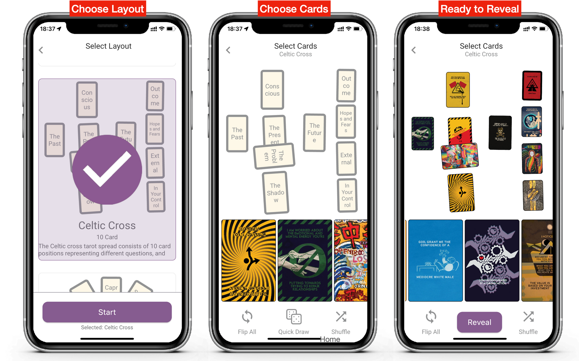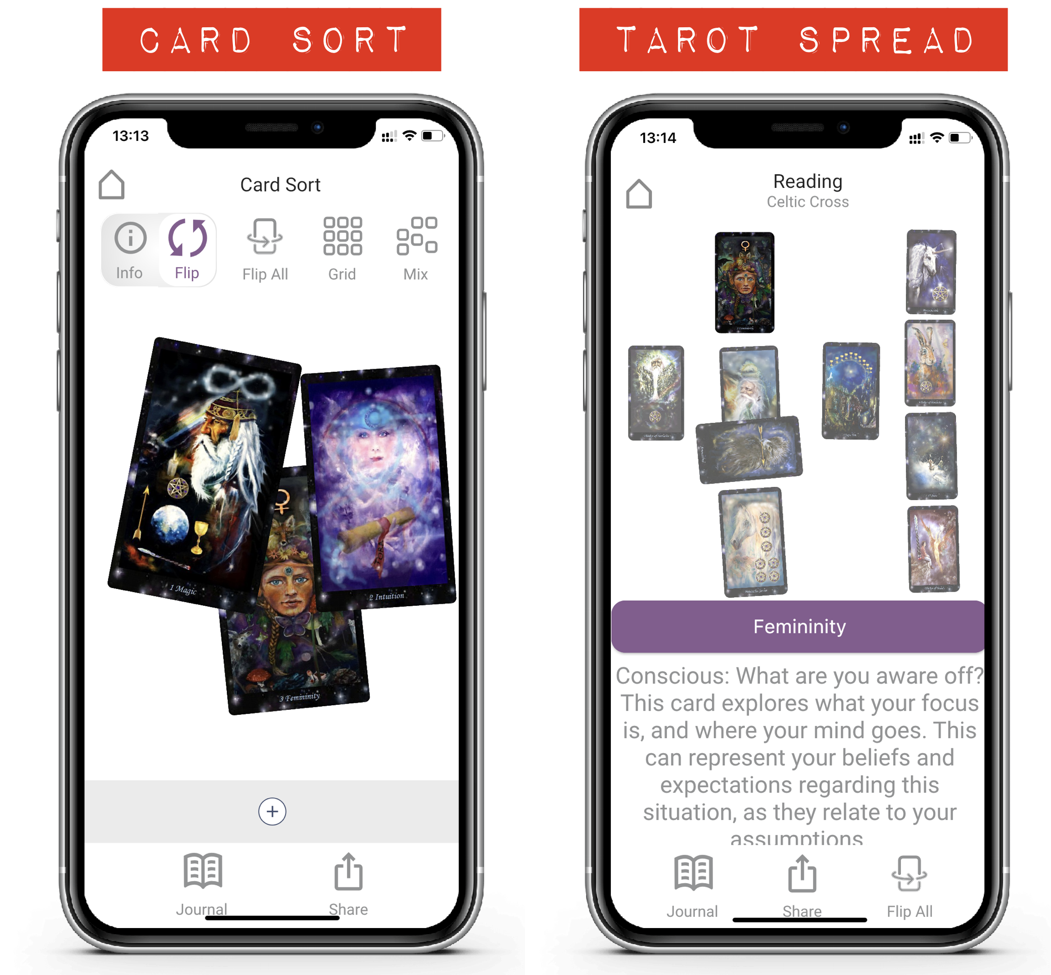 - Fewer icons & click to focus/ click to flip: We removed the flip / info button. Touch any card to put it into "focus". Once in focus, touch it again to flip. "Flip all" moved to the footer menu bar. As a result, more screen room is available for the spread. So the experience is improved.