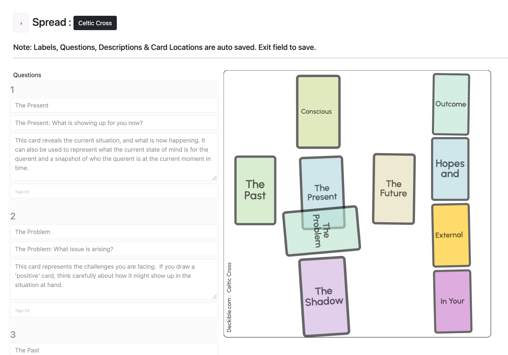 You can have as many cards are you want, you can scale, rotate and arrange the cards as you wish. The interface to create spreads is visual and simple, but you do need to put in effort to complete the following for each card in your spread: